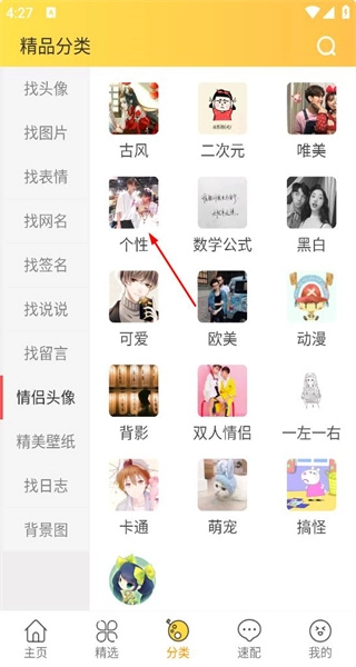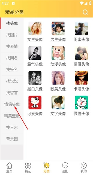 打开软件后,进入分类页面,可看到找头像等多个分类选项,点击其中的情侣头像分类。