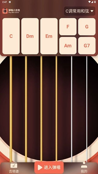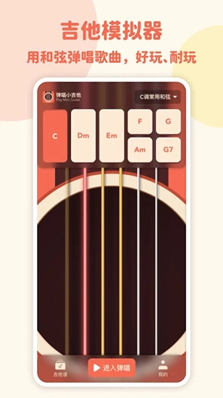 弹唱小吉他是一款面向吉他爱好者打造的应用程序,虚拟吉他模拟功能,方便用户借助手机开展吉他的练习与演奏。该软件涵盖C调、G调的常用和弦,用户不仅能自行设定和弦,还可给和弦增添外音。此外,它具备右手节奏自动弹奏的特性,能让练习过程更富趣味性。