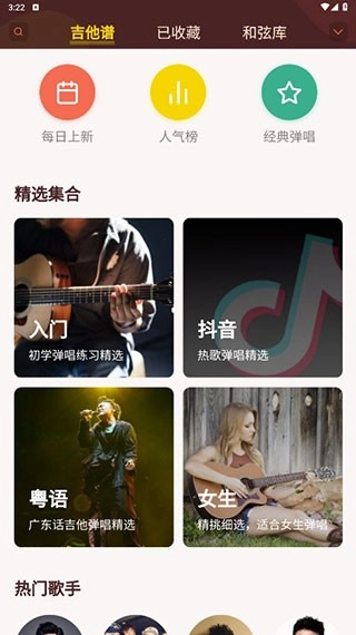 用户点击左下角的吉他谱选项,就能浏览丰富多样的吉他谱资源;若想查找特定歌手的歌曲吉他谱,向下滑动页面即可查看;此外,所有吉他谱都支持收藏功能。