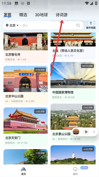 在首页,点击顶部导航栏的【诗词游】标签,即可进入诗词主题游玩模块。