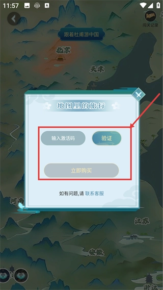 可以通过输入激活码并点击【验证】按钮,或者选择【立即购买】选项,来解锁该景点的诗词游相关内容。