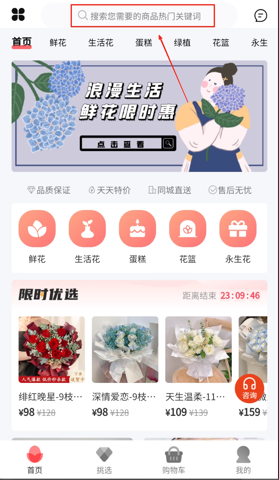 平台每天都会推送特惠专区和限时抢购的活动,再加上新人立减券的机制,用户可以用比市场价低30%的价格买到新鲜花束和定制蛋糕,这样就能实现高性价比的消费了。