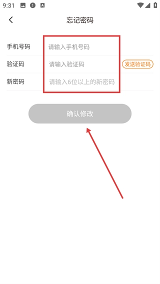 在密码找回页面,先填写【手机号码】,接着获取并输入【验证码】,再设置6位及以上的新密码,最后点击【确认修改】按钮,即可完成密码重置操作。