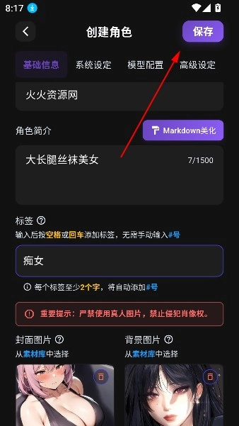 接着填写人物设定,完成后点击右上角“保存”即可。