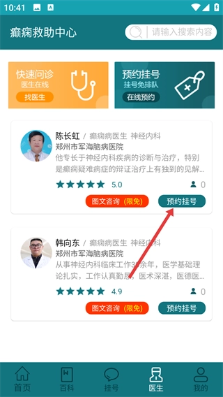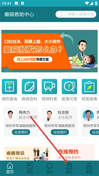 在【癫痫救助中心】的首页,点击页面底部的【医生】按钮,即可进入医生相关页面。首页还包含【病历查询】、【疾病百科】等功能板块。