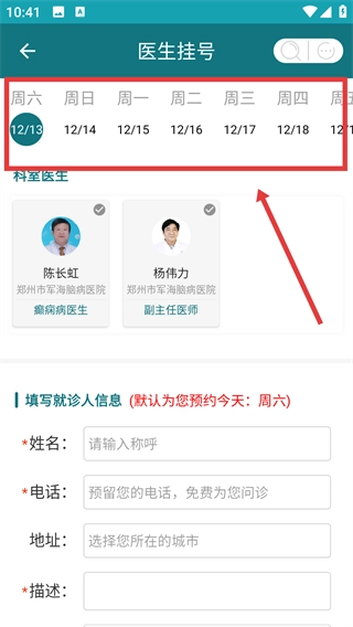 在【医生挂号】页面挑选就诊日期(例如12月13日),选好相应的医生之后,就会进入就诊人信息的填写页面。