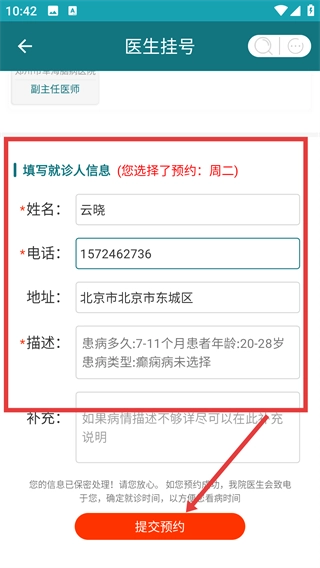 在就诊人信息栏中填写【姓名】、【电话】和【地址】,补充病情描述后,点击【提交预约】按钮即可完成挂号申请。