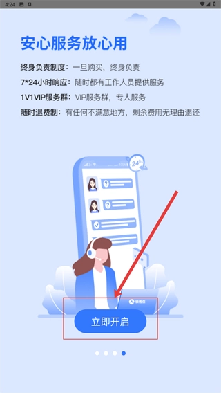 在服务介绍引导页,点击【立即开启】按钮,即可进入应用的功能使用环节。