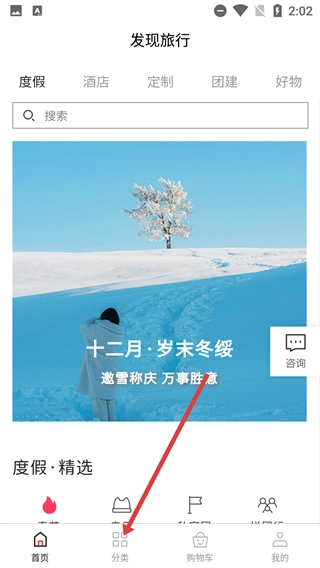 在“发现旅行”首页浏览内容后,点击底部导航栏的【分类】选项,进入商品分类页面。