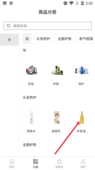 进入商品分类页面后,找到“头发养护”分类并定位,点击该分类下的【护发油】选项,即可进入护发油商品的搜索结果页面。