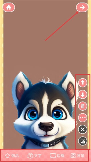 在美化编辑界面,能够借助【饰品】【文字】【边框】等功能对图片进行装饰,还能通过右侧的按钮来调整元素的位置、删除相关内容等。