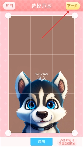 在选择范围页面,通过调整选框划定图片的展示区域后,点击【下一步】按钮,即可进入贴图美化的环节。
