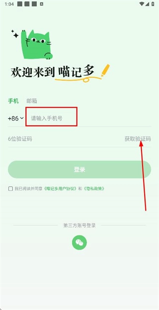 在登录页面输入手机号,勾选相关协议后,点击获取验证码按钮。