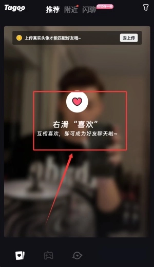 在首页可通过卡片滑动的交互形式浏览推荐用户,右滑操作代表喜欢,当双方互相关注后,聊天对话功能会自动开启。
