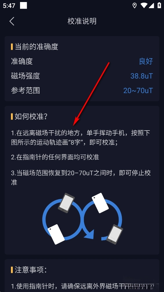 只需按照“8字”轨迹挥动手机,同时避开磁场干扰,就能查看详细的校准步骤了。