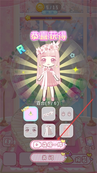 开启扭蛋后,系统会展示所获得的装扮(例如【百合-1/6】),点击对应的按钮就能查看或使用该装扮,从而完成角色外观的更换。