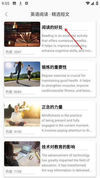 进入【英语阅读-精选短文】板块后,能挑选【阅读的好处】之类的主题短文,这些短文也标注了相应的热度信息。