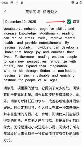 在短文详情页面,点击右上角的【译文】按钮,就能查看这篇英文短文的中文翻译,帮助你更好地理解内容。