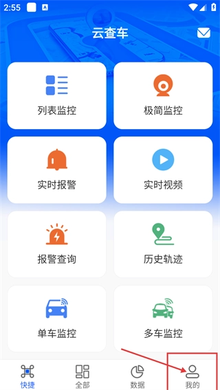 进入【云查车】的首页后,能使用【列表监控】下的【极简监控】等功能,之后在底部切换到【我的】页面,即可进入个人中心。