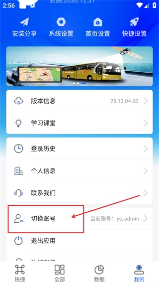 在【我的】页面里,找到【切换账号】这个选项,目前登录的账号是【ysadmin】,点击该选项就能更换登录的账号。