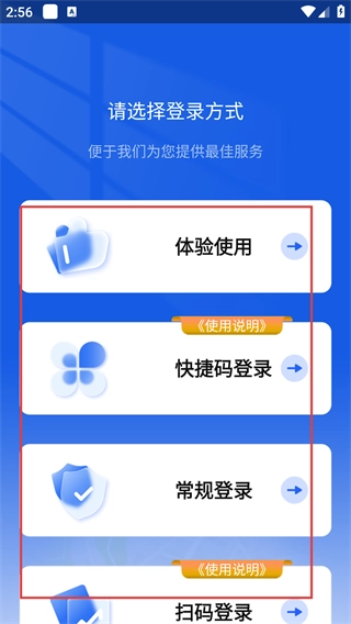 进入登录方式选择页面后,可选择【体验使用】、【快捷码登录】、【常规登录】等方式,选定后完成登录操作。