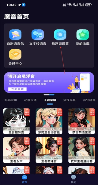 打开软件后,进入首页,看到自制语音包等功能,点击悬浮窗设置进入对应设置页面。