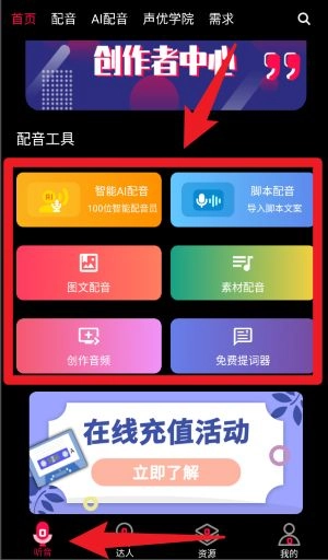 在听音首页,您可以利用智能AI配音、脚本配音、图文配音、素材配音等多种配音工具,以满足各类音频创作的不同需求。