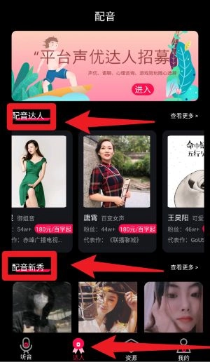 进入达人专区,能够查看配音达人和配音新秀的作品及资料,挑选合适的配音人员开展合作。