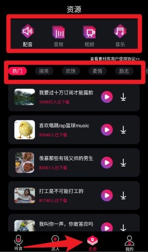 在资源页面能够按类别查找配音、音效、视频以及音乐素材,还支持依据热门、搞笑、欢快、柔情等标签来进行快速筛选。
