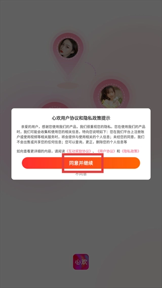 在阅读【心欢用户协议和隐私政策提示】后,点击【同意并继续】按钮,即可进入应用的登录流程。