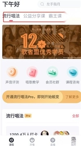 点击课程选项后,在这个功能板块里,我们能看到种类繁多的练歌课程,像流行唱法、公益分享课、霸王课、嘻哈说唱之类的都包含其中。
