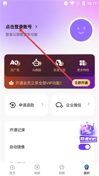 进入个人中心页面,点击登录按钮可解锁更多功能,此页面还提供、AI换脸等会员专属权益选项。