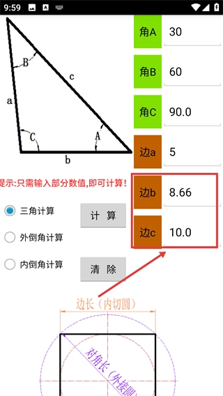 填入部分数值(比如角A=30、角B=60、边a=5)后,点击【计算】按钮,就能让系统自动计算出剩下的参数。