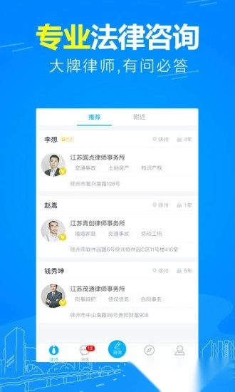 您身边的法律帮手,可查找附近律师,提供免费法律咨询服务,覆盖离婚纠纷、劳动仲裁、交通事故、遗产继承、债权债务、侵权赔偿、房产纠纷、知识产权等多个领域,能精准为您匹配专业律师;知名律师可协助处理律师函、代写法律文书、进行合同审查、担任法律顾问以及代理诉讼等,满足您的深层法律需求。