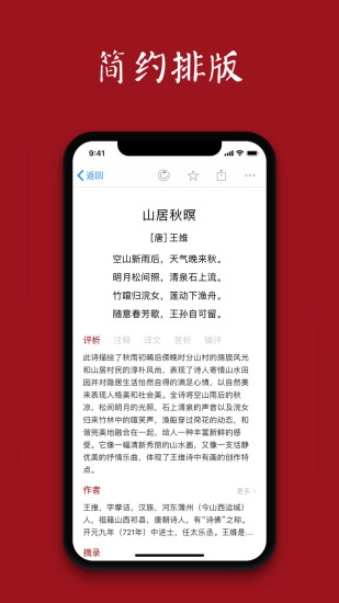 这是一个无社交功能的诗词学习阅读平台,界面设计简约,核心功能聚焦于诗词的学习与赏析。平台拥有数百万首优质古典诗文的庞大数据库,用户可以在这里深入领略古人经典诗词的丰富内涵,细细品味古文作品中的深远意境。期待您的加入,一同探索古典文学的魅力。