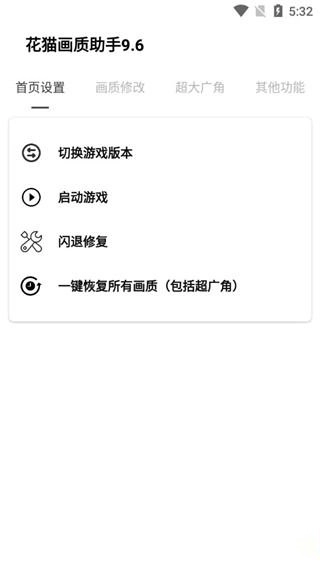 在手机乐园下载花猫画质助手9.6正式版后,玩家可在软件首页的设置板块使用切换游戏版本、启动游戏、闪退修复、一键恢复所有画质等功能。