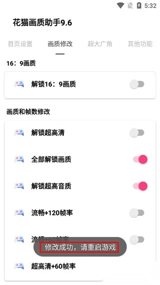 点击“画质修改”选项后,玩家能够使用解锁16:9画面比例、开启超高清画质、一键解锁所有画质选项、解锁超高音质、设置流畅+120帧/60帧以及超高清+60帧等多种功能。