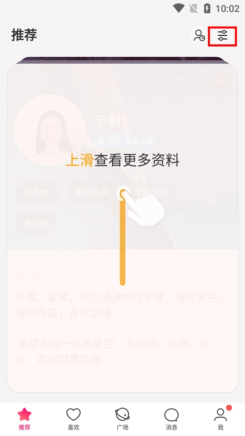 设置完成后返回主页,点击底部的爱心图标来标记喜欢,你可以多点击几个进行喜欢操作。