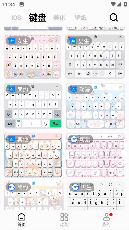 还提供了ios、可爱、男生、女生等各种风格的键盘供你选择。