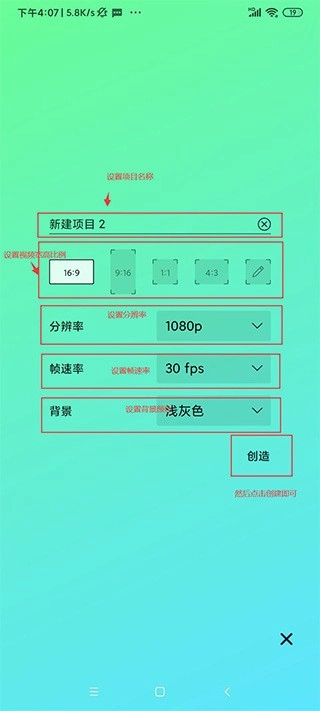 可对项目名称、宽高比例、分辨率、帧速率以及背景颜色进行设置。