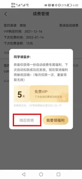 商家为了阻止你取消自动续费,可能会推出一些诱人的优惠活动,遇到这种情况不用理会,直接点击【残忍拒绝】按钮就行。要是之后还需要使用VIP功能,等用到的时候再开通也不迟,开通之后别忘了按照上面的步骤再次关闭自动续费功能。