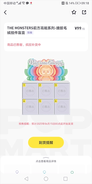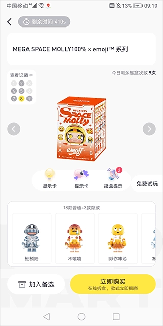 每天18点我们会准时补货,为了不错过抽盒机会,建议您提前设置提醒,及时参与补货时段的抽盒活动。