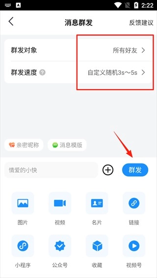选择群发对象和设置速度,点击群发