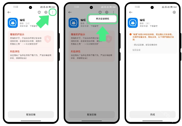第三步:关闭“增强防护”功能。第四步:重新安装蝙蝠App,安装时请勾选“已了解此应用未经检测,可能存在风险”这一选项,然后点击“继续安装”按钮,这样就能顺利完成安装了。