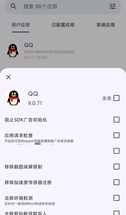 开启AdClose模块,在应用列表里挑选并点击对应的应用,激活Hook功能。