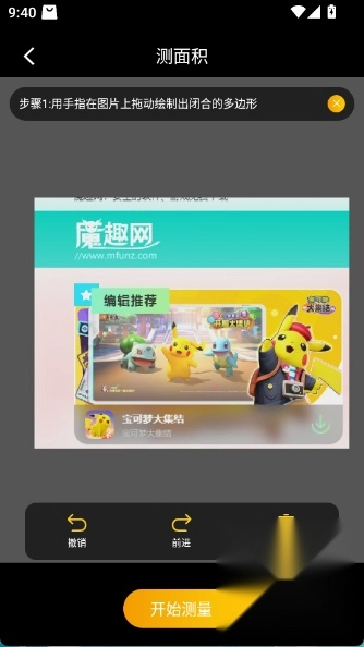 测量面积时,您只需用手指在图片上拖动,画出一个闭合的多边形,接着点击开始测量按钮就行。另外,还支持实时截图进行测量。
