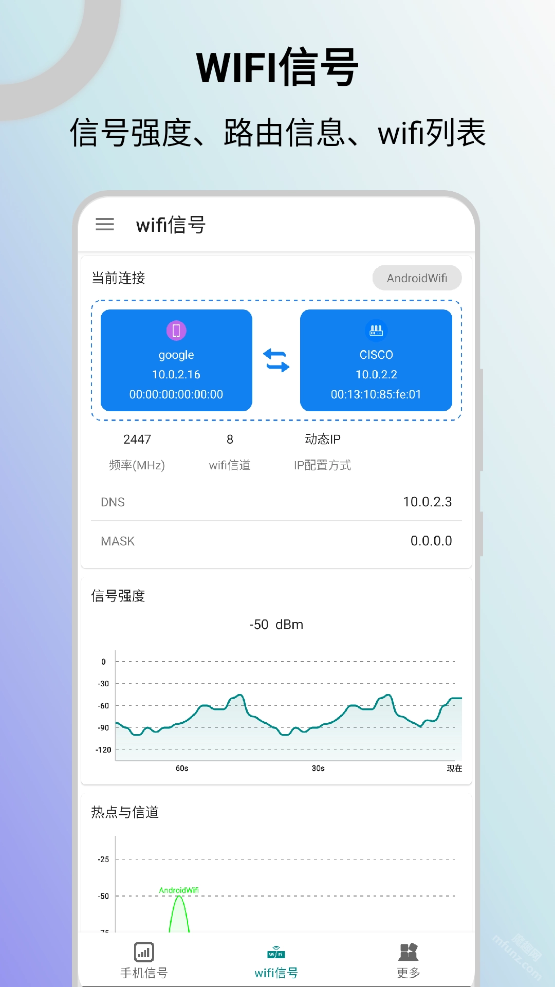 WiFi信号监测:实时监测WiFi信号强弱,呈现MAC地址、信道、IP配置、连接速率等重要信息,对网络安全性进行检测,同时列出已连接的设备,帮助用户更便捷地管理网络。