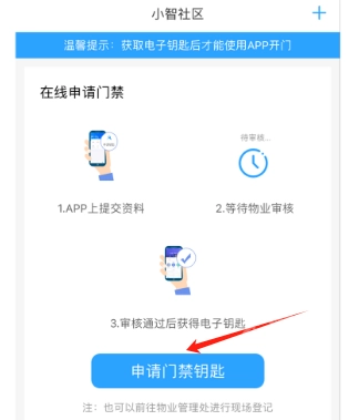 在小智社区提交资料至物业管理处进行审核,待审核通过后,您就能获取电子钥匙了。