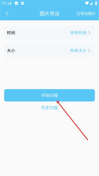 在图片导出页面设置好时间和大小的筛选条件后,点击【开始扫描】按钮就能启动图片扫描流程。