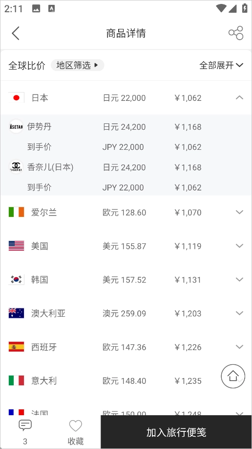 最后,在商品详情页向下滑动,就能看到全球各个地区的价格了。